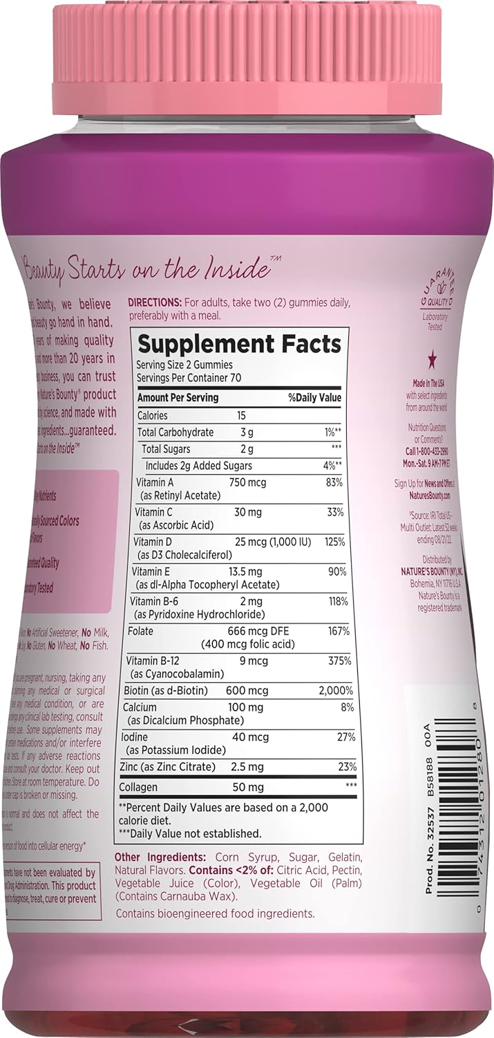 Nature's Bounty Optimal Solutions Women’s Multivitamin Gummies offers a unique formula — created for women— to provide your body with over 10 key nutrients every day in a delicious raspberry and mixed berry flavored gummy. Nature's Bounty Optimal Solutions Women’s Multivitamin Gummies provide you with the vital nutrients to support a healthy and beautiful body. (1) Each daily serving provides your body with antioxidant Vitamins E and C, Calcium for bone health and Vitamin D for immune health. (1) This daily vitamin supplements also offers 50 mg of Collagen per serving. Other key nutrients, like B Vitamins, provide cellular energy support by helping convert food into energy. (1) This multi vitamin and mineral supplement plus collagen has no artificial flavors or sweeteners. Adults can take two raspberry-flavored gummies per day, preferably with a meal. Each bottle of Nature's Bounty Optimal Solutions Women's Multivitamin Gummies contains 140 delicious raspberry flavored gummies.
